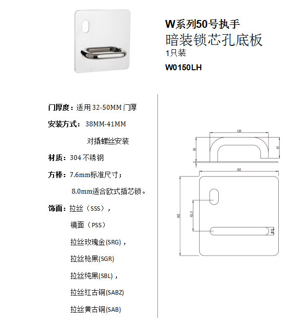 W系列50號執手 暗裝鎖芯孔底板