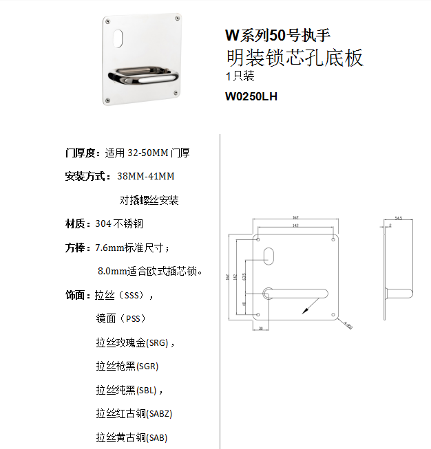 W系列50號執手 明裝鎖芯孔底板